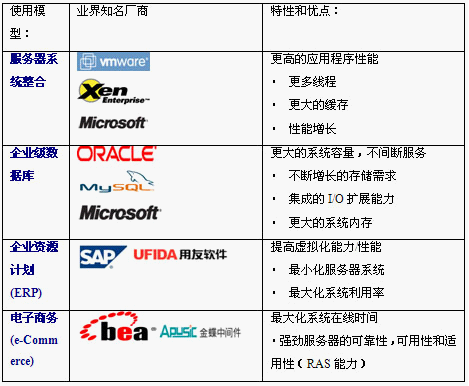 为了应对这些挑战,通过削减您的1路和2路服务器,替换成以较少的高性能4路服务器,将为您在现在和将来提供更具成本效益和可靠的解决方案。可满足企业应用环境中以及虚拟化应用环境中的服务器整合、数据库应用、企业资源规划和商务智能等应用时对服务器高性 能、高可靠性和高可扩展性的需求。